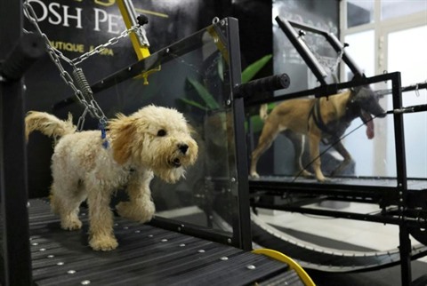 Après avoir été dûment attaché à une laisse par les employés sur l'appareil, Oscar, un Welsh Corgi de deux ans, court sur place à vive allure sur le petit tapis noir bordé de vitres censées éviter les chutes. Sa propriétaire, Mozalfa Khan, se réjouit d'avoir trouvé ce lieu, où elle dit venir deux à trois fois par semaine.