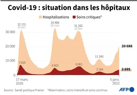 | Graphique montrant l'évolution des hospitalisations et des personnes en soins critiques en France, au 5 janvier. |