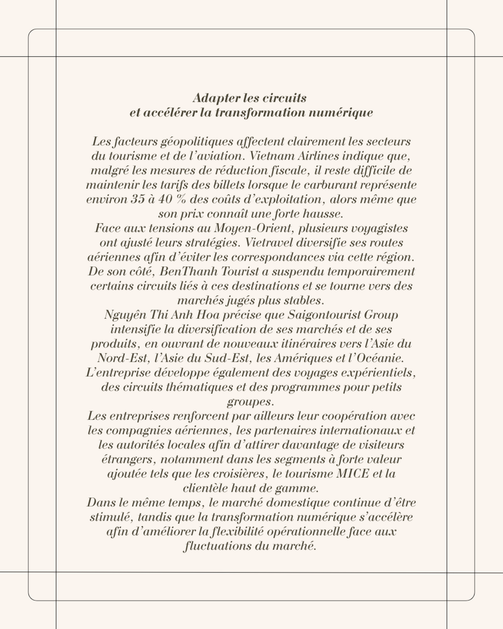 "La responsabilité des entreprises touristiques est de toujours préparer des solutions flexibles afin de garantir des voyages sûrs et fluides pour leurs clients. Les fluctuations des coûts constituent certes un défi, mais elles stimulent aussi l’innovation, l’optimisation opérationnelle et l’amélioration de l’expérience touristique", souligne Nguyên Thi Anh Hoa.