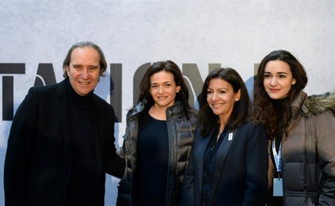 | De gauche à droite : Xavier Niel, fondateur de Free ; Sheryl Sandberg, numéro deux de Facebook ; Anne Hidalgo, maire de Paris ; et Roxanne Varza, directrice de la Halle Freysinnet, le 17 janvier à Paris. |