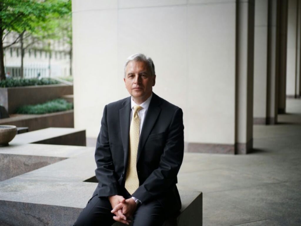| Le directeur du Département européen du Fonds monétaire international, Alfred Kammer, pose devant le siège du FMI. |