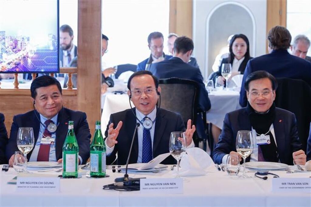 | Nguyên Van Nên (centre) prend la parole lors d'un atelier dans le cadre de la 55e réunion annuelle du Forum économique mondial à Davos, en Suisse. |