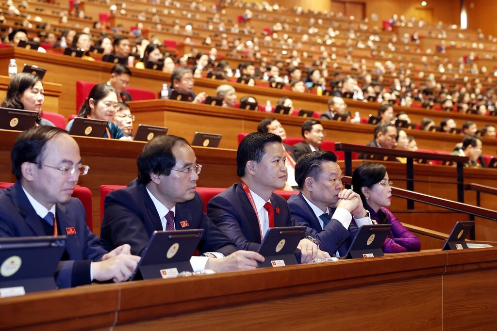 | La délégation du Comité provincial du Parti de Thai Nguyên lors de la séance d'ouverture du XIVe Congrès national du Parti. |
