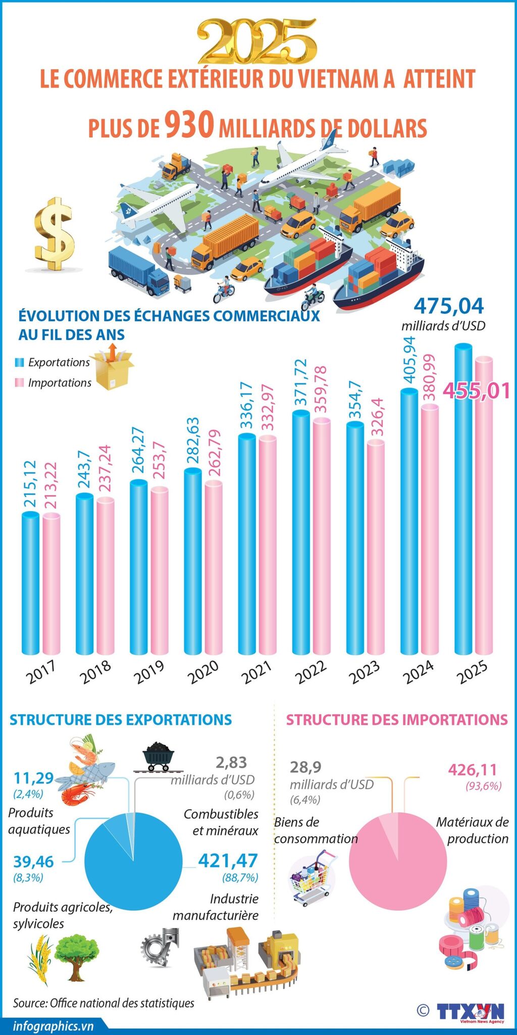 Sur l’ensemble de l’année 2025, la valeur totale des échanges d’import-export du Vietnam est estimé à 920 milliards de dollars, en augmentation de 16,9% (soit plus de 133 milliards de dollars) par rapport à 2024. Ce résultat propulse le Vietnam parmi les 15 principales puissances commerciales mondiales, illustrant les avancées significatives du pays sur la voie de la mondialisation et du renforcement de sa compétitivité à l’exportation.