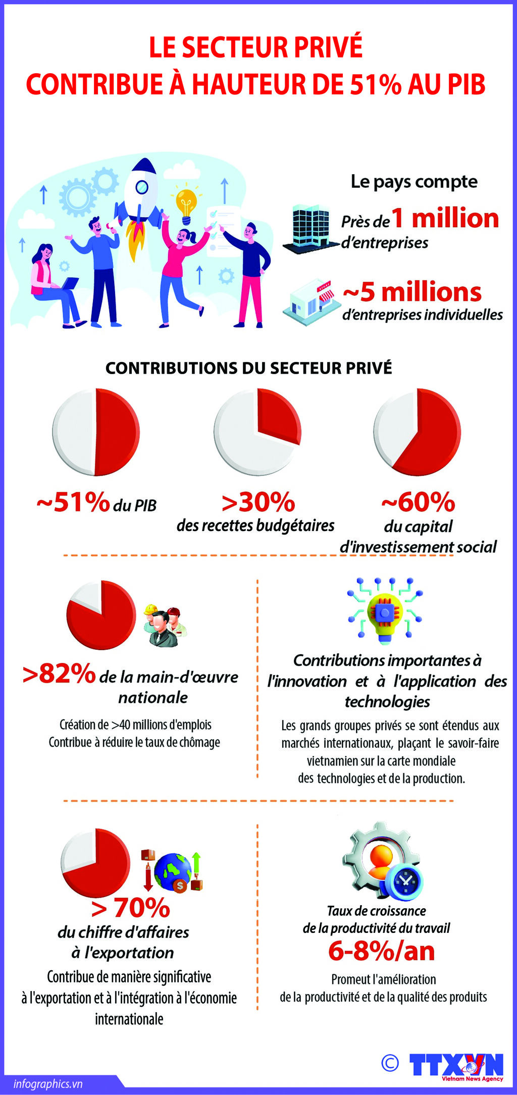 Officialisé dès 1986 lors du VIe Congrès national du Parti, puis galvanisé par la Résolution N°10 de 2017 du Comité central du PCV, le privé représente 51% du PIB, avec ses quelque 6 millions d’entités : près d’un million d’entreprises et plus de 5 millions de foyers commerçants. Il est la clé d’un avenir triomphant. Sans lui, pas de nation forte. En tant qu’élément essentiel de l’économie vietnamienne, ce secteur contribue pour plus de 30% aux recettes budgétaires de l’État et crée plus de 40 millions d’emplois, soit plus de 82% de la main-d’œuvre totale. Il occupe près de 60% du capital d’investissement social.