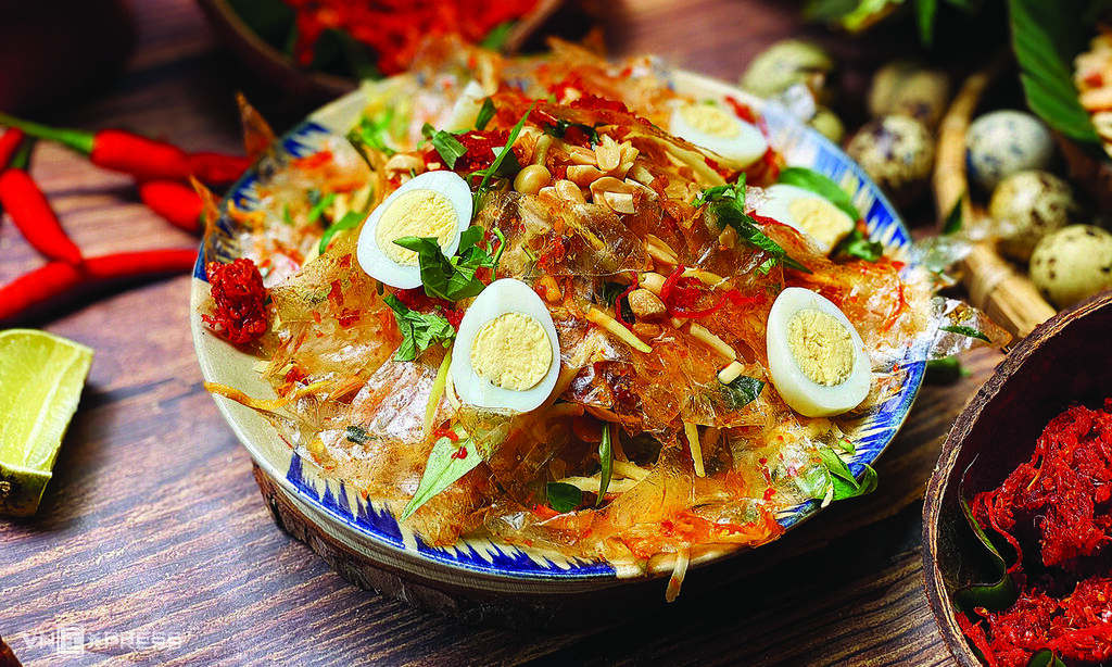 | Le "bánh tráng trôn", salade de galette de riz mixte. |