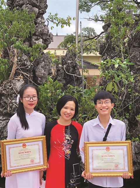 | Mme Thu (centre) avec ses deux lycéens titulaires du prix national en langue française. |