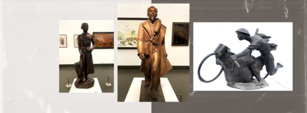 | De gauche à droite : les sculptures "Le guérilla H'mông" de Minh Dinh, "Le père de toutes nos forces armées" de Cân Thu Công, et "Le pays tout entier entre dans les champs de bataille" de Luu Danh Thanh. |