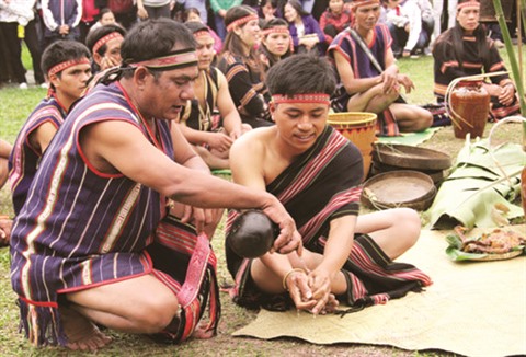 | Ksor H’nao (gauche) et des artisans d’ethnies minoritaires reproduisent un mariage traditionnel des Gia Rai. |