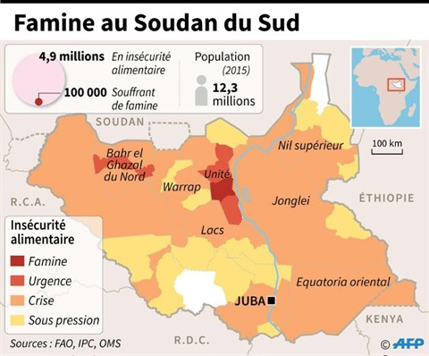Lundi 20 février, trois organisations de l'ONU (UNICEF, FAO et PAM) avaient indiqué que 4,9 millions de Sud-soudanais, soit 42% de la population totale du pays, avaient besoin d'une aide alimentaire d'urgence.