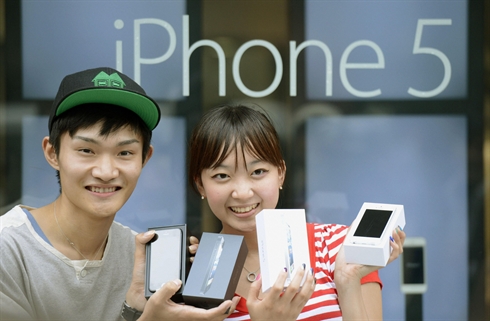 | Deux des premiers Japonais titulaires d’iPhone 5, le 21 septembre à Tokyo. |