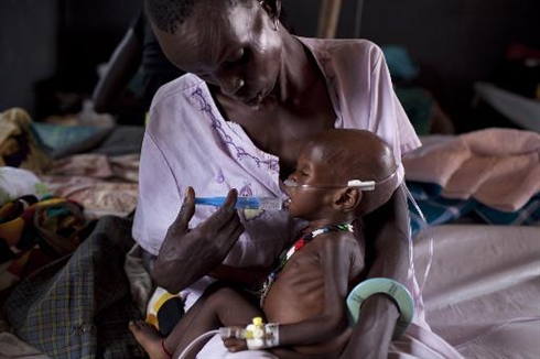 | Un enfant souffrant de malnutrition reçoit des soins dans un camp médical de Médecins sans frontières, le 3 mars à Minkamman, au Soudan du Sud. |