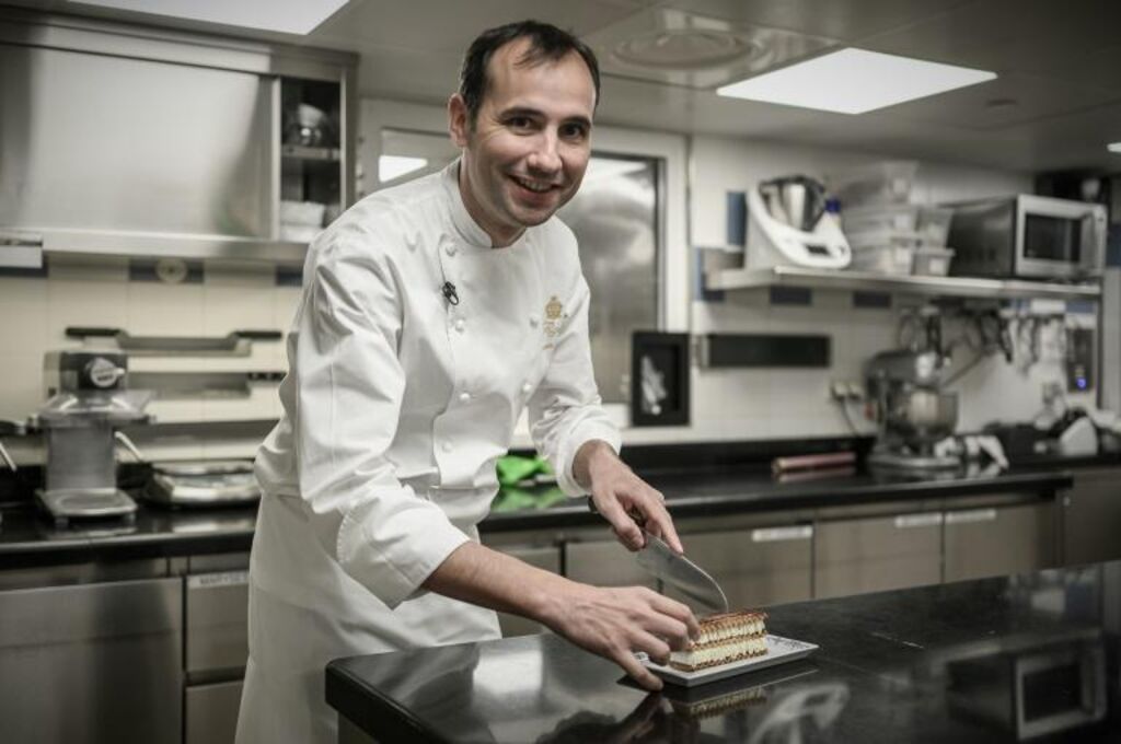 | Le pâtissier du Ritz François Perret en train de préparer un millefeuille à Paris. |