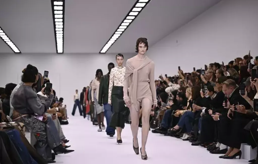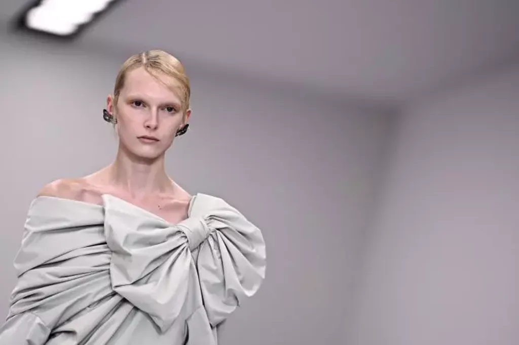 Chez Acne Studio, on a revu ce vert "Brat" éclatant que l'on pensait remisé depuis la fin du "Brat Summer" lancé pae la chanteuse Charli XCX. Mais il y avait surtout du skai et du cuir, des vestes aux épaules larges, qui se porte sur un torse nu.