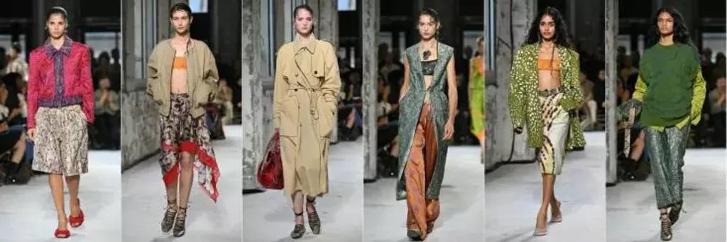 | Combinaison de mannequins portant des créations de Van Noten. |