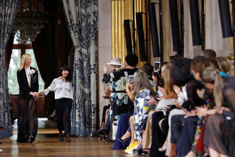 | La créatrice française Bouchra Jarrar (droite) lors du défilé Lanvin, le 28 septembre à Paris. |