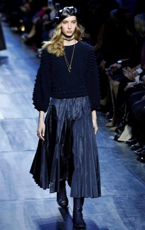 Pour sa première collection pour Dior en septembre, la directrice artistique Maria Grazia Chiuri avait proclamé son féminisme sur des t-shirts et présenté des silhouettes d'escrimeuses. Dans cette deuxième collection de prêt-à-porter, la créatrice italienne poursuit son exploration du thème de l'uniforme : il est militaire avec des bérets noirs qui donnent aussi une allure révolutionnaire. C'est aussi un uniforme de travail, avec des combinaisons et des pantalons d'ouvriers, des jeans.