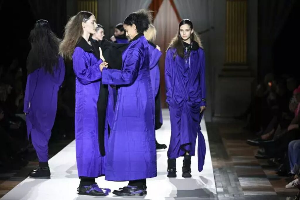 Point de couleur chez Yohji Yamamoto, qui a fait défiler dans les très chics salons de l'Hôtel de Ville des silhouettes toutes de noir vêtues, fidèle à son surnom de "poète noir", avec quelques nuances de gris, un peu de blanc, et des touches de violet électrique.