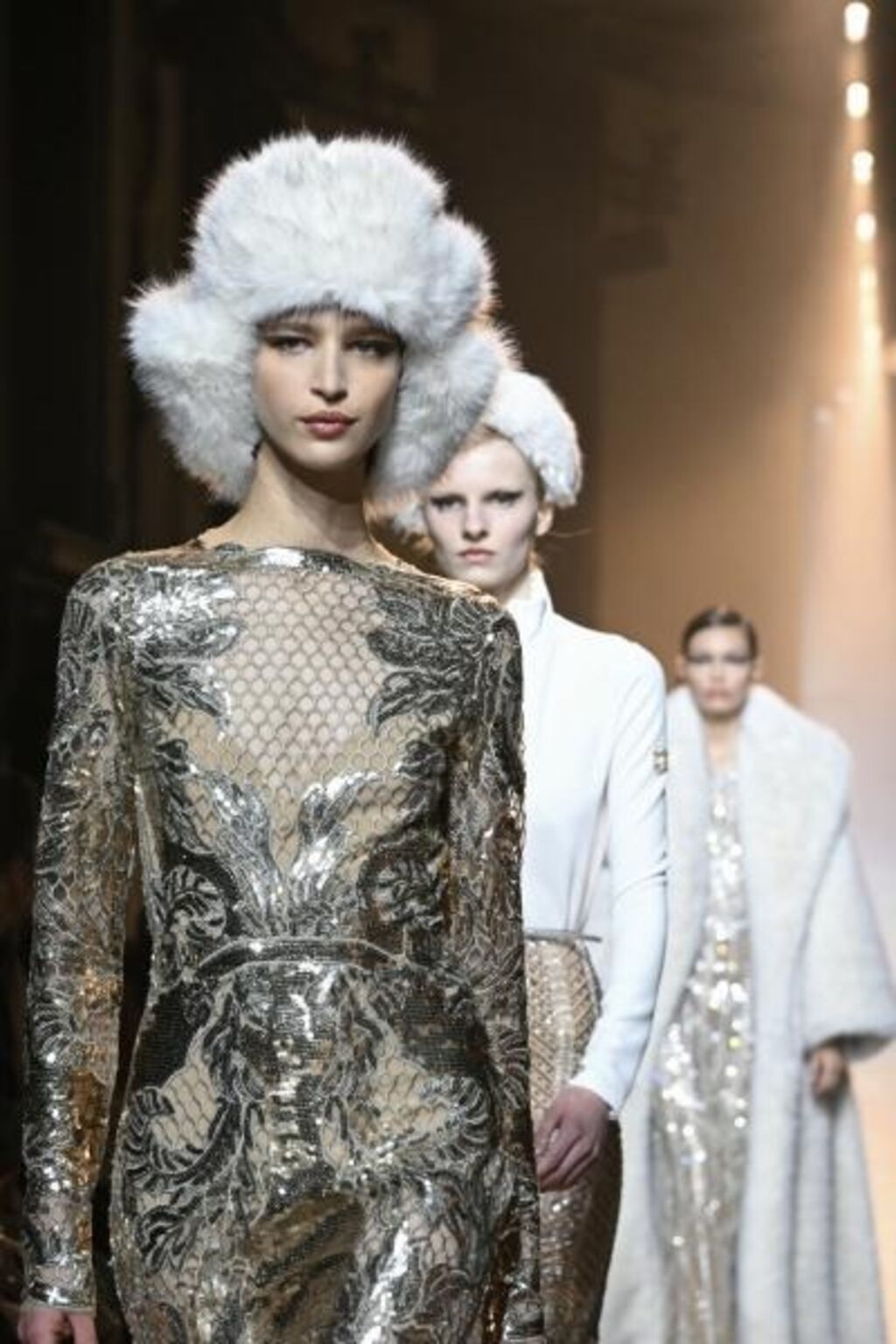 Grosse tendance de cette saison, la fourrure était partout chez Elie Saab, avec de gros blousons portés sur des pantalons fluides ou des leggings, de longs manteaux, des étoles, de grands sacs à mains, des bottes hautes, des toques, des serre-têtes, jusqu'aux bustiers d'élégantes robes.