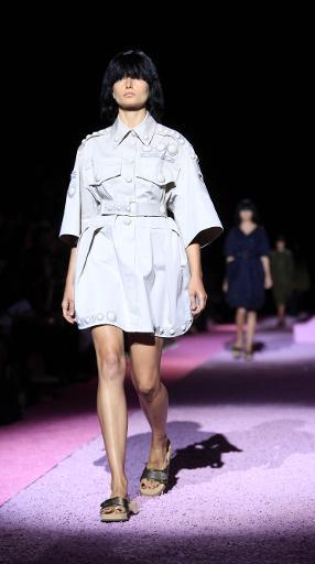 Après une série de longues tuniques ou d'ensembles veste-pantalon à la croisée des chemins entre le trench et l'uniforme d'un soldat nord-coréen, structurés par de gros boutons, le créateur new-yorkais Marc Jacobs a partagé sa nouvelle passion pour les bulles.