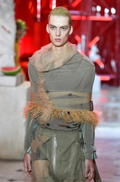 | Chez Maison Margiela, l'homme se pare de plumes et d'organza, pour la collection printemps/été 2019, à Paris le 22 juin. |