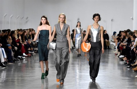 Chez Paco Rabanne, le directeur artistique Julien Dossena a revisité la robe métallique emblématique de la griffe, en la transformant en une sorte de cotte de mailles légère, qui se porte avec d'épaisses chaussures dorées ou argentées et des mitaines montant le long des bras.