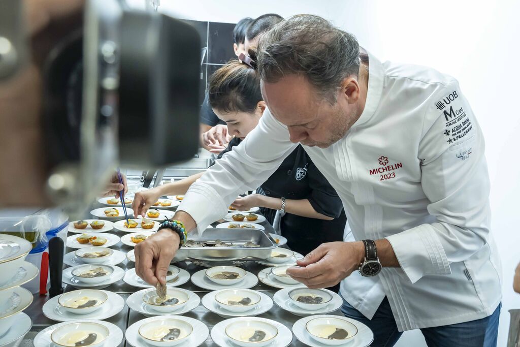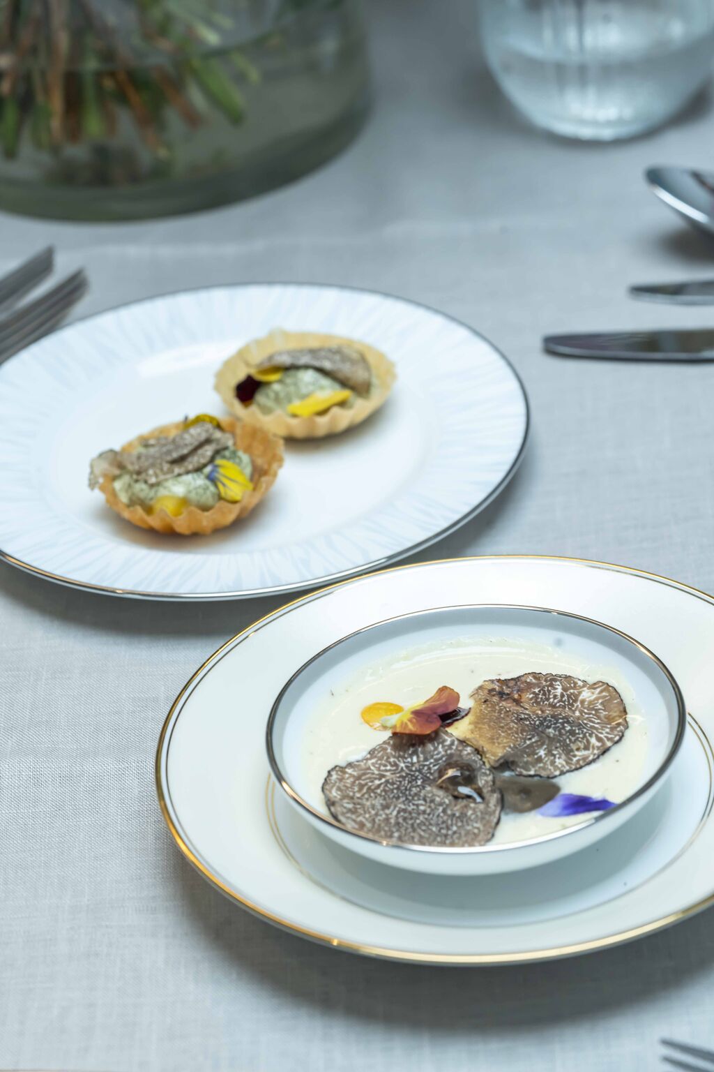 Tous ont exprimé leur émerveillement devant les plats du talentueux Thierry Drapeau, une parfaite harmonie de couleurs et de goût. La fête a commencé par une purée de pommes de terre et gâteau aux truffes, un plat sophistiqué accompagné d'un verre de champagne FreiXenet.