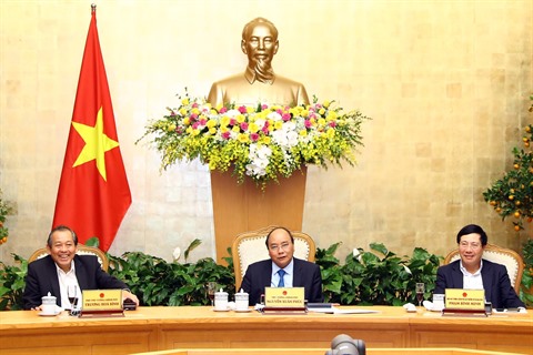 | Le Premier ministre Nguyên Xuân Phuc (centre) lors de la réunion de la permanence du gouvernement, le 21 février. |