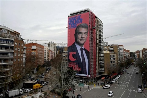 | Une affiche géante du candidat Joan Laporta couvre une façade d'un immeuble à Barcelone, le 16 décembre 2020 à quelques semaines de l'élection pour la présidence du Barça. |