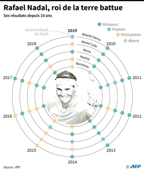 Même arrivé Porte d'Auteuil moins souverain qu'à l'accoutumée, avec trois défaites et un seul titre (Rome) sur ocre en 2019, voilà Nadal, qui a fêté ses 33 ans lundi 3 juin, à une victoire d'un douzième triomphe historique à Roland-Garros et d'une 18e couronne en Grand Chelem qui lui permettrait de revenir à deux longueurs du record détenu par Federer (20).