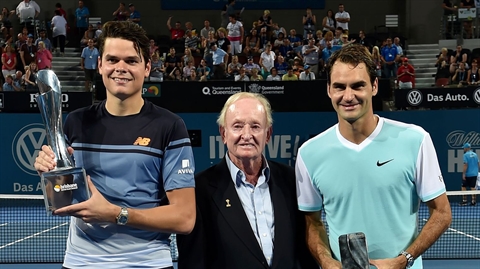 | La légende du tennis australien, Rod Laver (centre), pose avec le vainqueur du tournoi de Brisbane Milos Raonic (gauche) et son adversaire Roger Federer, le 10 janvier. |