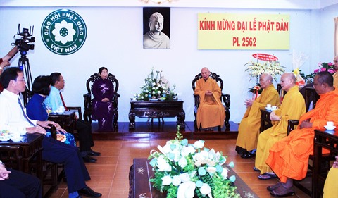 | La secrétaire adjointe du Comité du Parti pour Hô Chi Minh-Ville, Vo Thi Dung (gauche), est venue féliciter le bonze supérieur Thich Thiên Nhon, le 28 mai. |