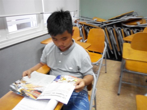 | Duy est plongé dans sa lecture du Courrier du Vietnam. Hervé Fayet/CVN |