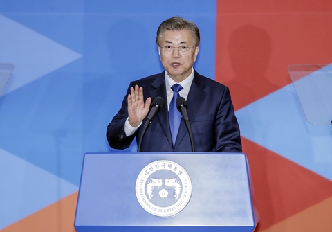 | Le nouveau président sud-coréen Moon Jae-in prête serment le 10 mai à Séoul. |