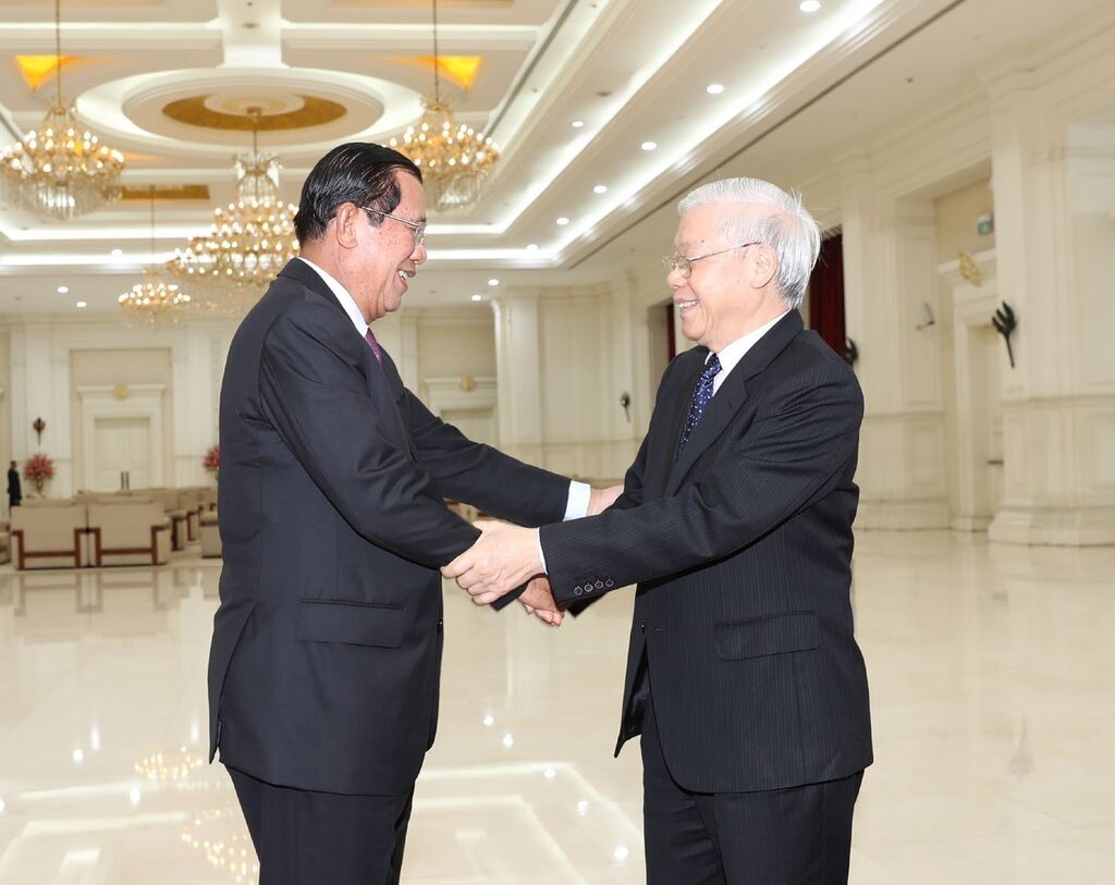 | Le secrétaire général du Comité central du PCV, Nguyên Phu Trong (droite), et le président du PPC et Premier ministre cambodgien, Samdech Techo Hun Sen, lors de la visite du dirigeant vietnamien au Cambodge, en février 2019. |