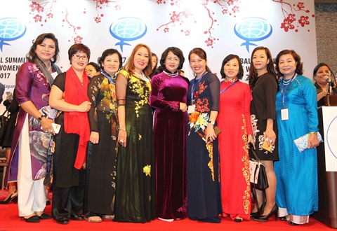 | La vice-présidente de la République, Dang Thi Ngoc Thinh (5e) et des femmes d'affaires vietnamiennes. |