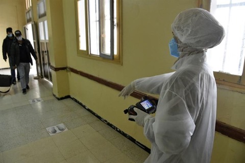 | Du personnel médical mesure la température des voyageurs à l'aéroport de Tindouf, dans le Sud-Ouest de l'Algérie, le 26 février. |