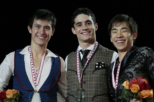 | L'Espagnol Javier Fernandez (centre), le Canadien Patrick Chan (gauche) et le Japonais Nobunari Oda, le 27 octobre à Windsor au Canada. Photo : AFP/VNA/CVN |