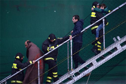 | Des rescapés du "Norman Atlantic" à leur arrivée à bord du Spirit of Piraeus, le 29 décembre à Bari en Italie |