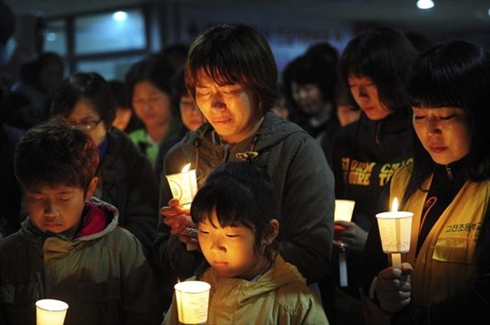 | Rassemblement en hommage aux disparus du ferry naufragé en Corée du Sud, le 17 avril. |