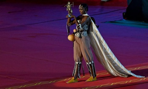 | Une femme tient l'Étalon d'Or de Yennenga attribué au réalisateur somalien Ahmed Khadar pour son film "La femme du fossoyeur" lors de la cérémonie de clôture du Fespaco, le 23 octobre à Ouagadougou, au Burkina Faso. |