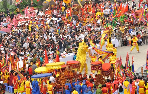 Des milliers d' habitants ont afflué pour assiter aux spectacles de Hat xoan (chant printanier) - classé patrimoine culturel immatériel de l'Humanité, de danse du tambour, de gongs de l'ethnie Muong ainsi que de chants folkloriques de l'ethnie Cao Lan .