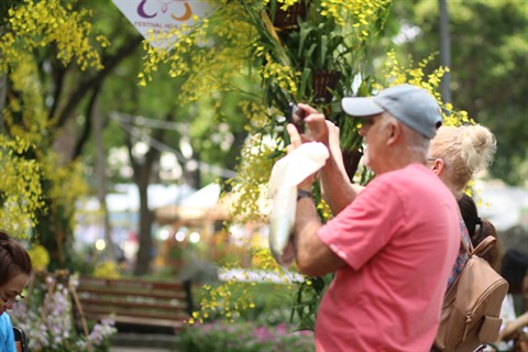 | Des visiteurs étrangers capturent la beauté des fleurs. |