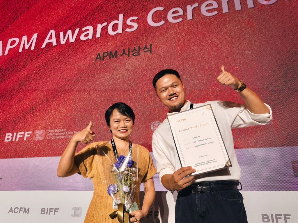 | Le réalisateur Nguyên Pham Thành Dat et la productrice Nguyên Huu Thi Tuong Vi reçoivent la récompense pour "Bò sua bay" lors du Festival international du film de Busan. |