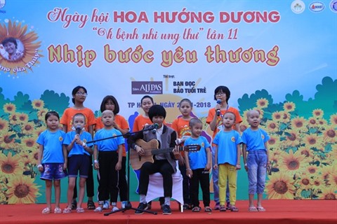 | La chanteuse Lê Cat Trong Ly et des enfants malades interprètent ensemble une chanson pour soulager les enfants cancéreux. Photo: CPV/CVN |