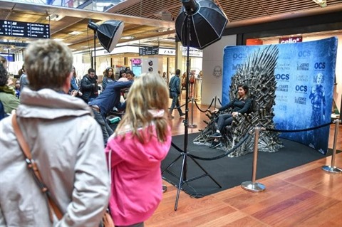 | Une femme est photographiée sur le trône de la série "Game of Thrones", lors du festival Séries Mania, le 27 avril à Lille. |