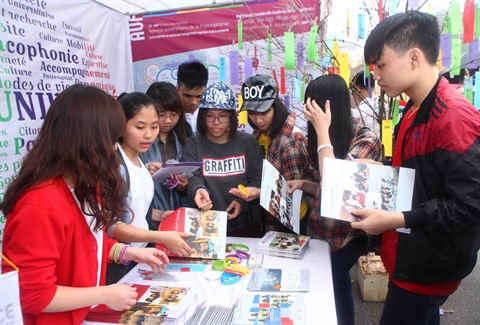 | Des étudiants de l’Université de Hanoï distribuent des prospectus sur la Francophonie. |