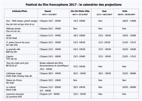 Le cinéma francophone sera aussi à l’honneur dans cette édition 2017 avec de nombreuses projections de films qui sont organisées à Hanoï, Vinh (province de Nghê An, Centre), Huê (Centre) et Hô Chi Minh-Ville. Ce 10e festival du film francophone représente la diversité culturelle de la Francophonie avec 11 films, présentés par les ambassades du Canada, de France, du Maroc, de Suisse, de la délégation Wallonie-Bruxelles, par le Département du cinéma et de l’OIF (voir encadré). L’ensemble des films est sous-titré en vietnamien et les films vietnamiens sont sous-titrés en français.