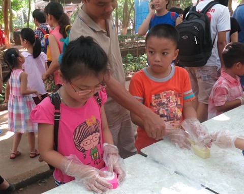 | Des enfants préparent leurs gâteaux de la lune au Musée d’ethnographie à Hanoï. |
