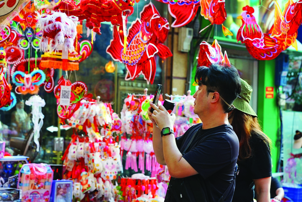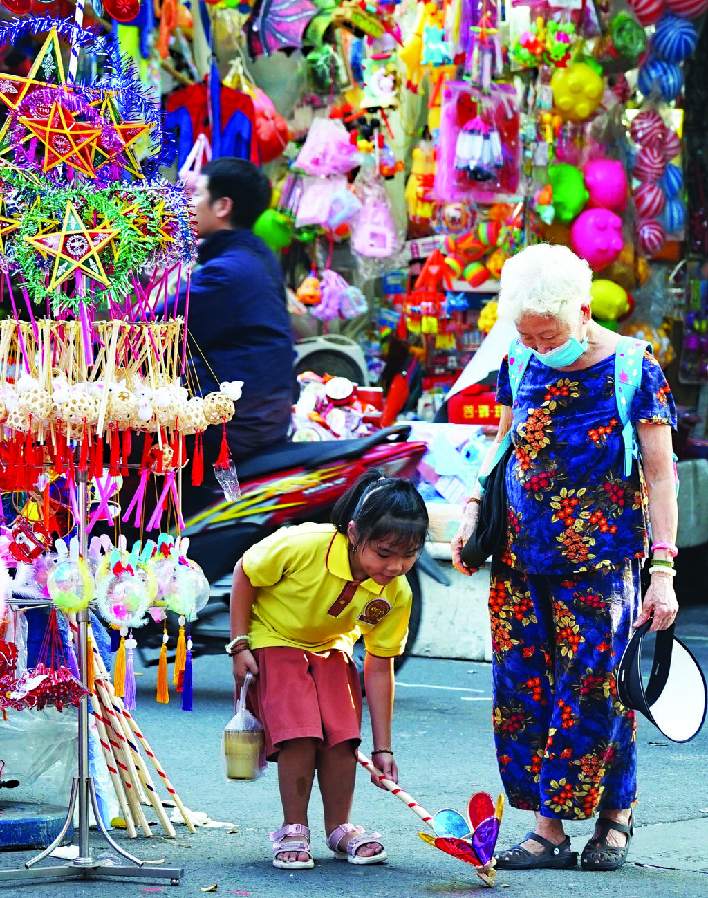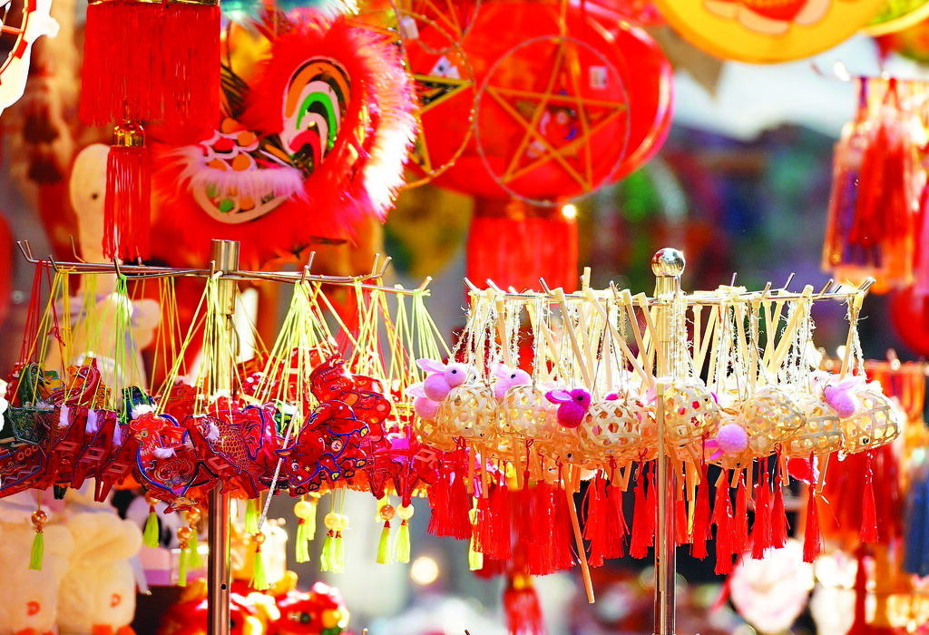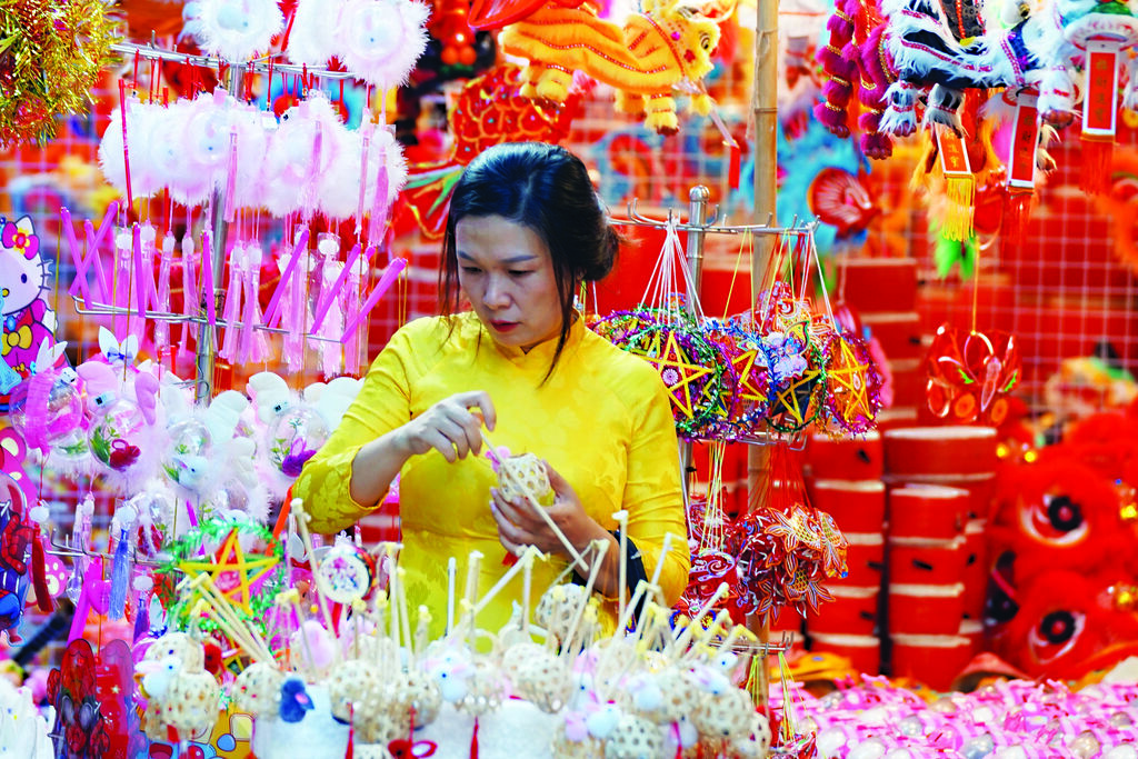 | Les stands de jouets traditionnels sont décorés avec des lanternes, créant une ambiance féerique. |